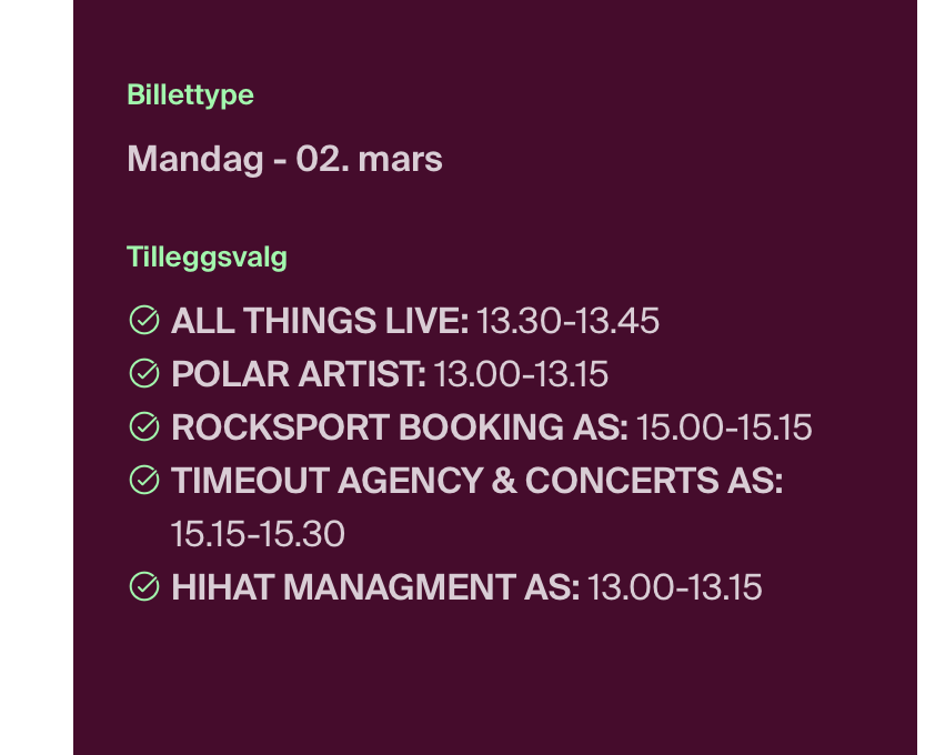 Alle dine valg finner du på din tilsendte mobilbillett. Her følger en instruksjon for hvordan du kan finne tilvalgene på pc / mobil.